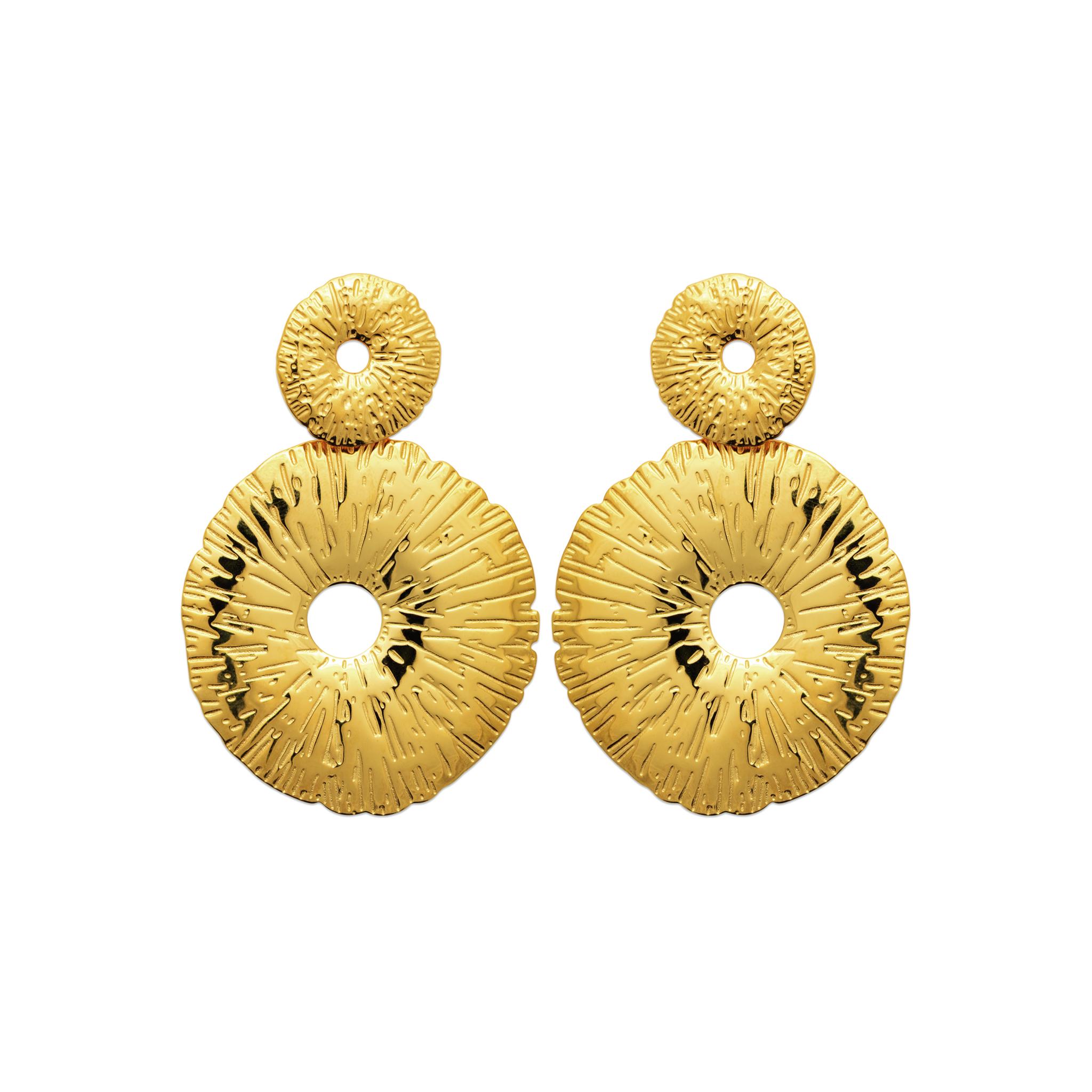 Réalisées en acier inoxydable doré, elles sont résistantes, durables et conservent leur éclat au fil du temps. Leur double disque martelé crée un jeu de lumière unique qui attire le regard et sublime le visage.