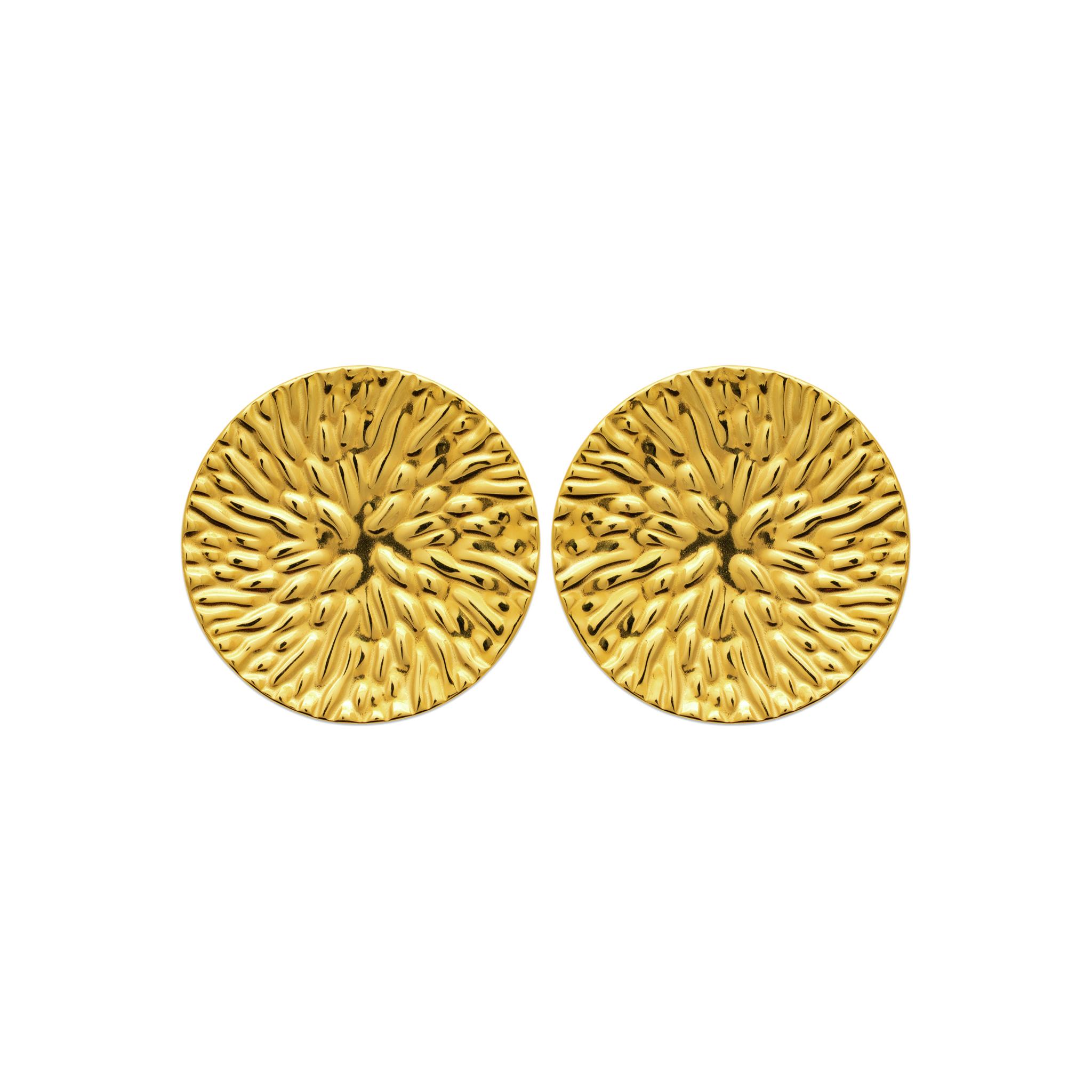 Audacieuses et lumineuses, les boucles SORAYA en acier inoxydable doré captivent par leur disque texturé inspiré des rayons du soleil.