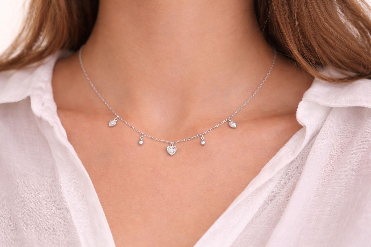 Conçu en argent 925 rhodié, il offre une brillance durable et une excellente résistance au ternissement. Sa fine chaîne est sublimée par plusieurs petits pendentifs en forme de cœur délicatement suspendus, créant un mouvement léger et élégant.