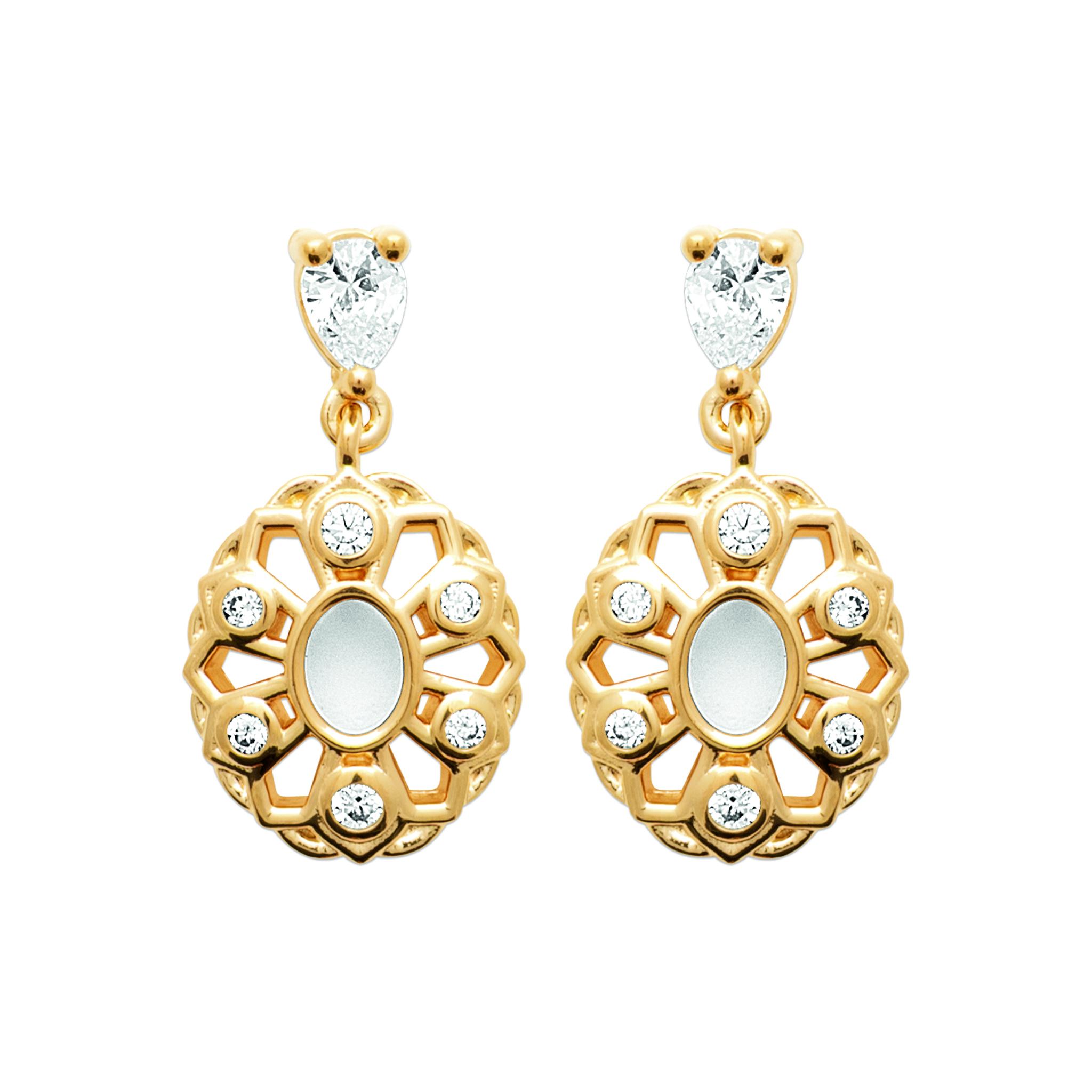 Composées d’un pendentif ovale finement ajouré, elles sont sublimées par de petits zirconiums lumineux et une pierre supérieure en forme de goutte, apportant une touche de finesse et de mouvement.