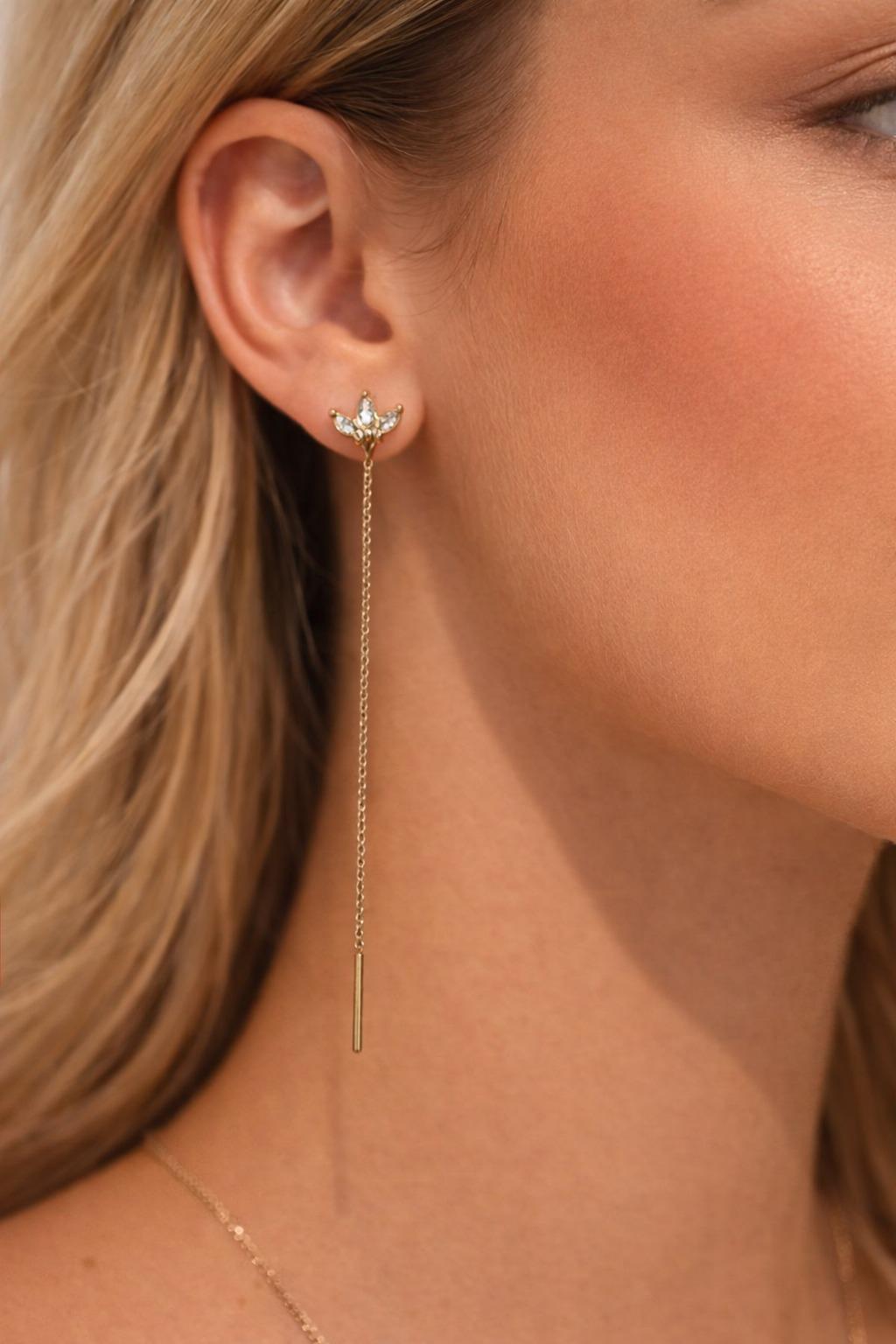 Craquez pour les boucles d’oreilles Lotus, un modèle raffiné qui allie douceur et élégance. Leur petite fleur ornée de pierres lumineuses apporte une touche chic, tandis que la chaîne fine allonge joliment le cou pour un rendu très féminin.