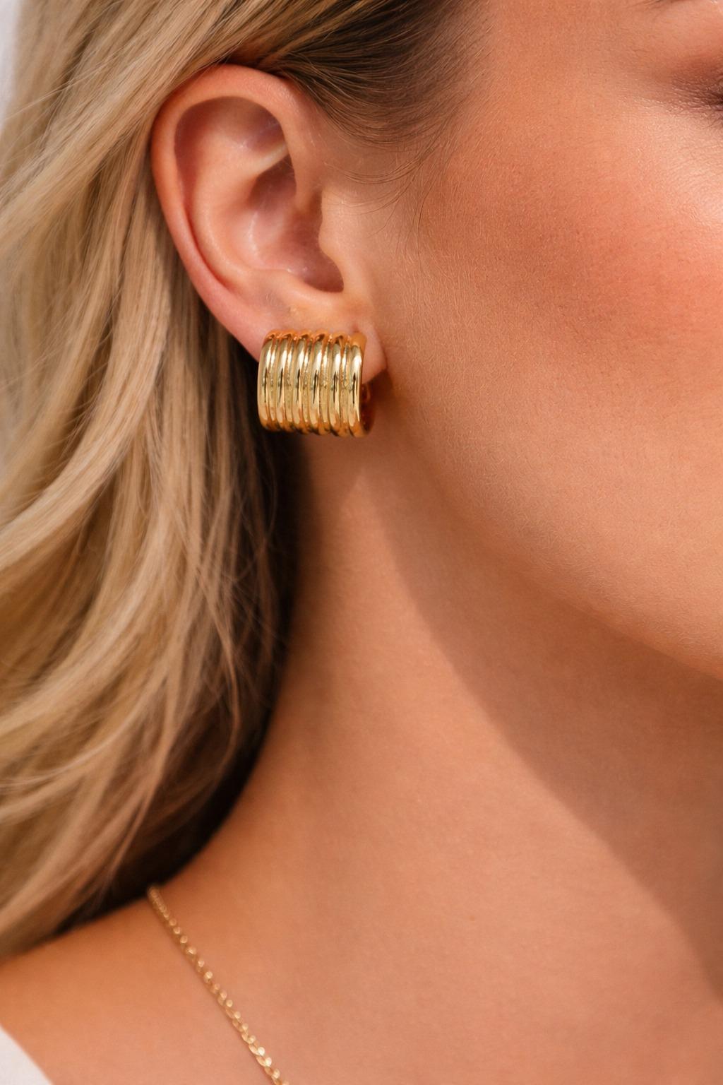 Les boucles d’oreilles Velia en acier inoxydable 316L offrent un style moderne et affirmé grâce à leur design strié et leur finition dorée lumineuse. Un bijou élégant, résistant et facile à porter au quotidien.