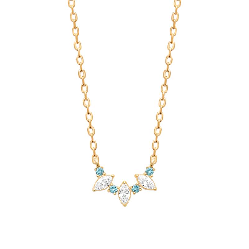 Le collier ALYSÉA séduit par son design délicat et raffiné. Son pendentif élégant associe pierres brillantes en forme de marquise et zirconiums bleutés, créant un jeu de lumière subtil et féminin.