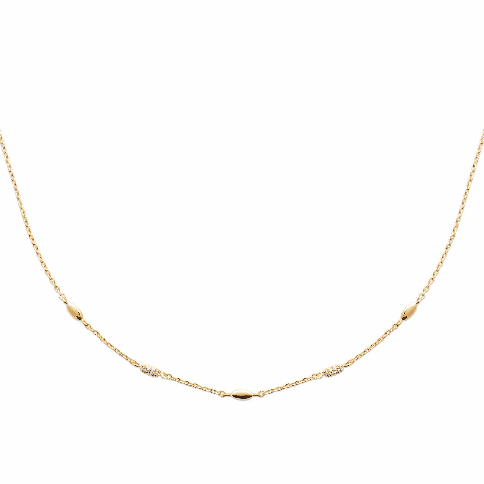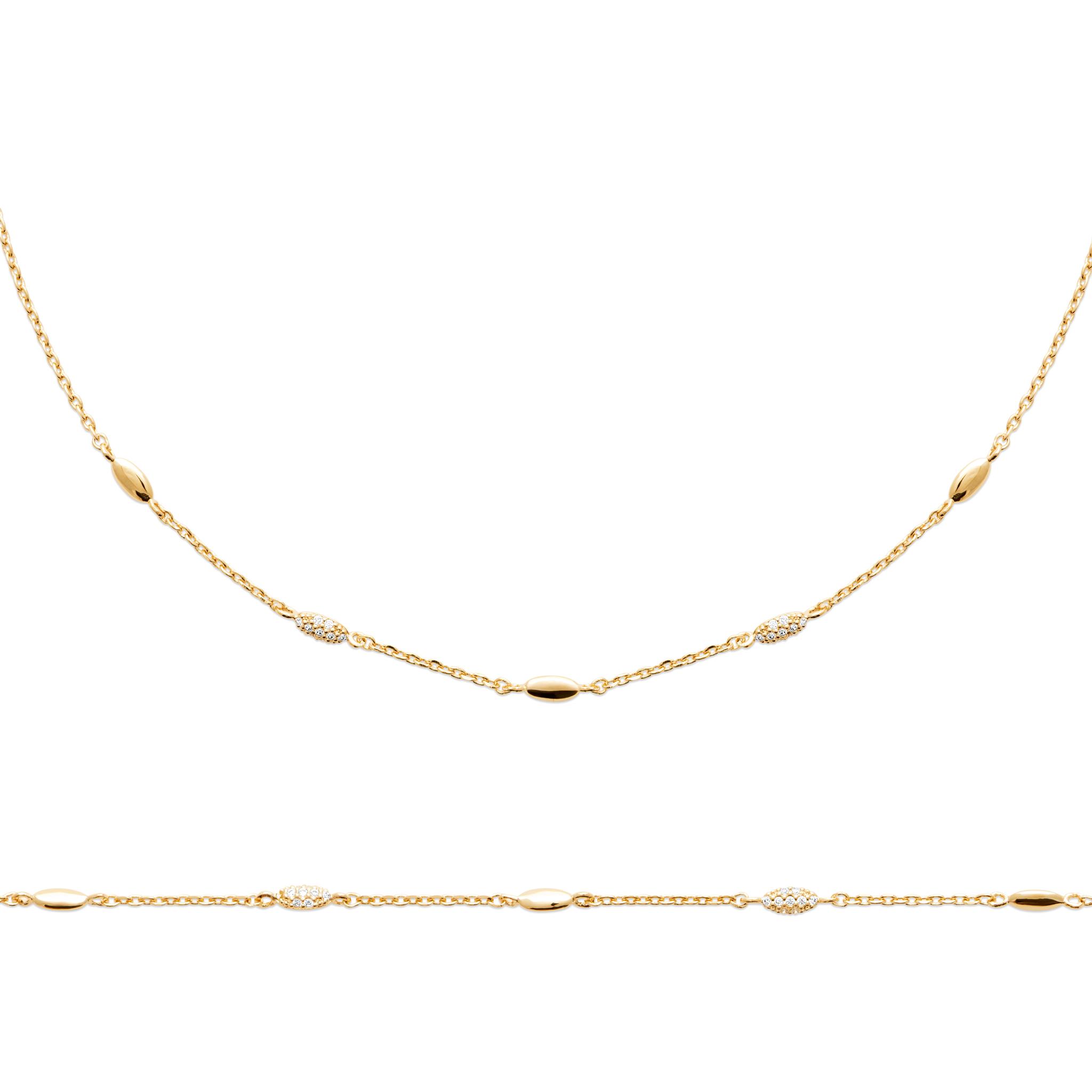 Sa chaîne fine est sublimée par de petits motifs ovales polis, accompagnés de délicats détails sertis de zirconiums qui apportent une brillance subtile.